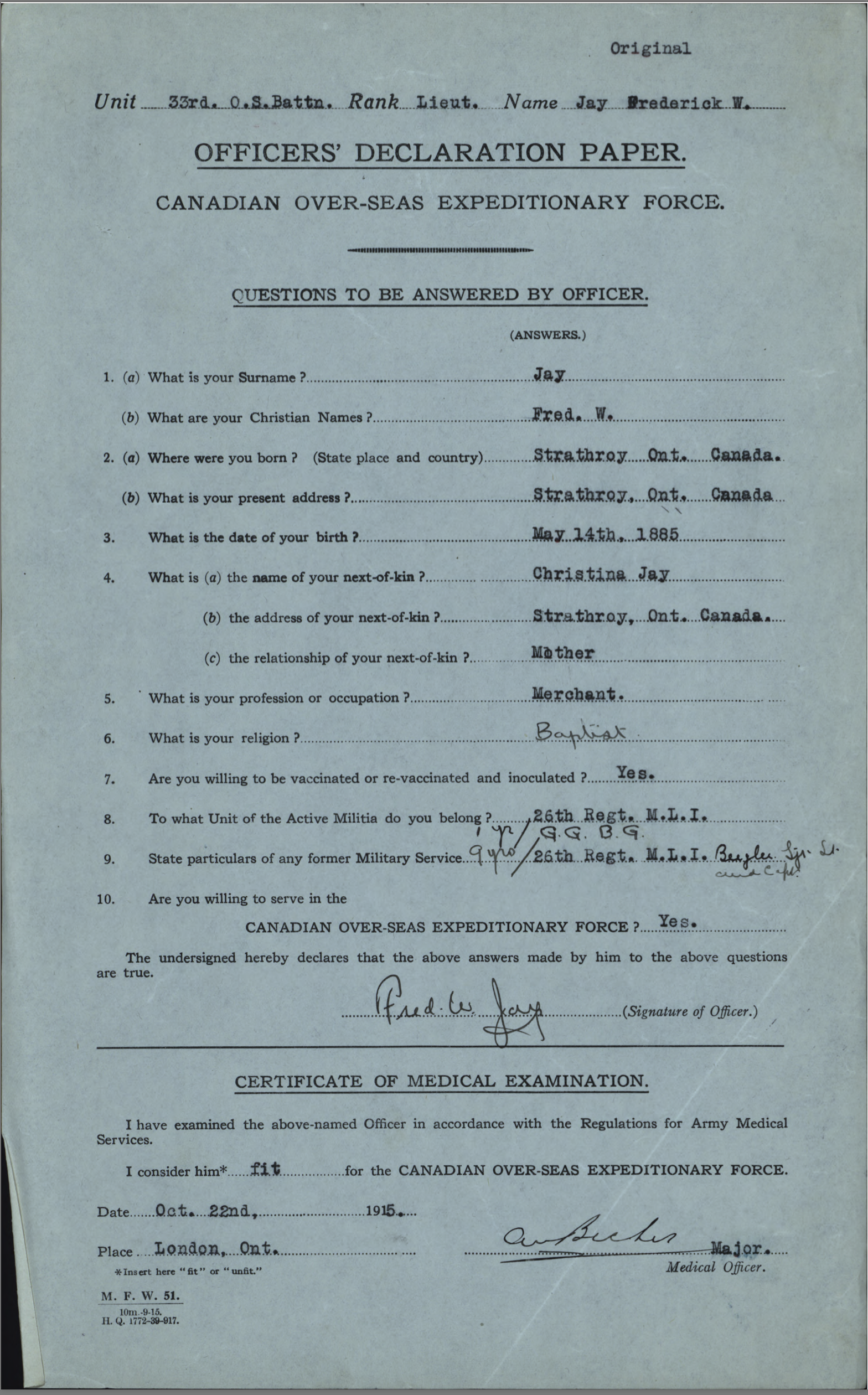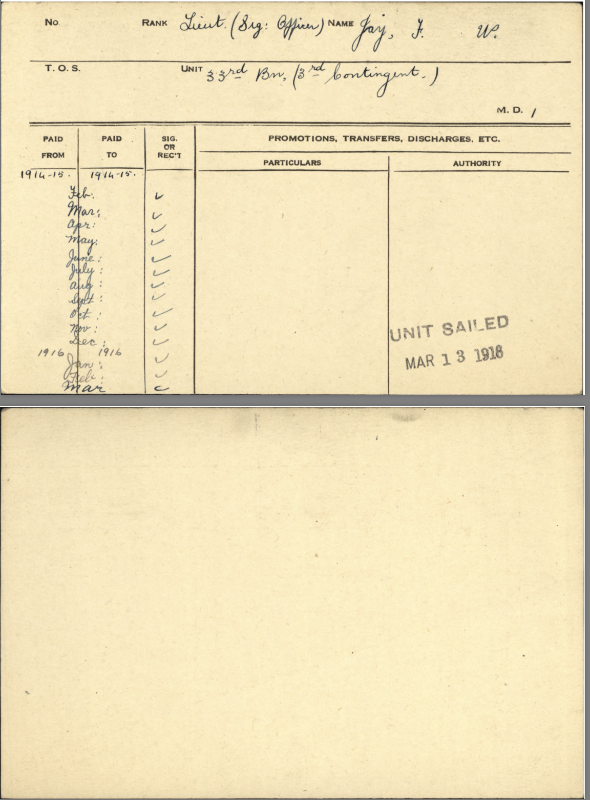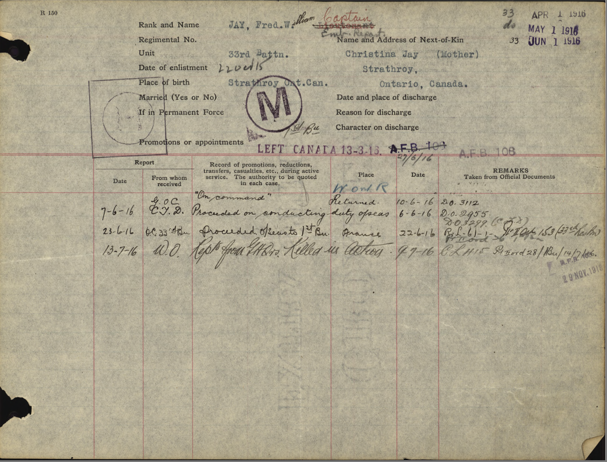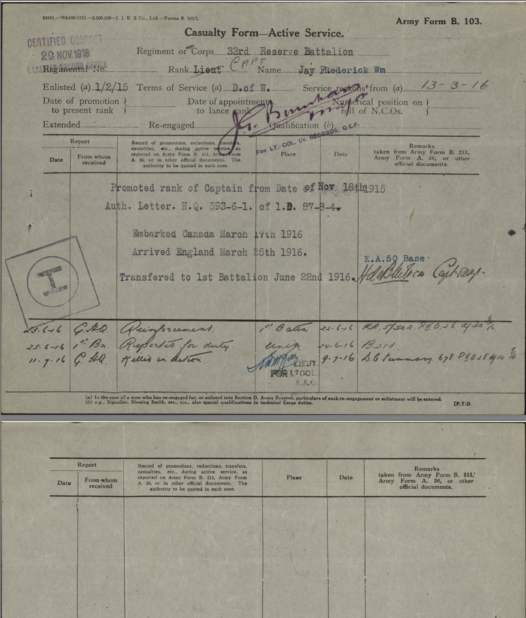 After the 33rd Battalion was redistributed, he served in the 1st Btn. Thus, Fred Jay does not have the usual “Attestation” paperwork but has an “Officers’ Declaration Paper” instead. He was promoted to Captain on November 18, 1915, while still in Canada.