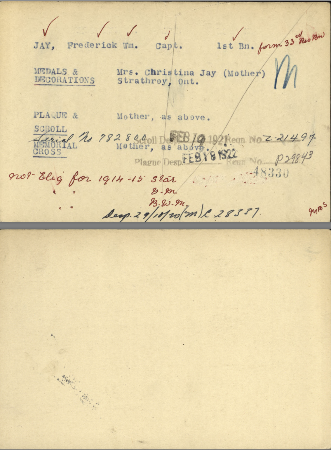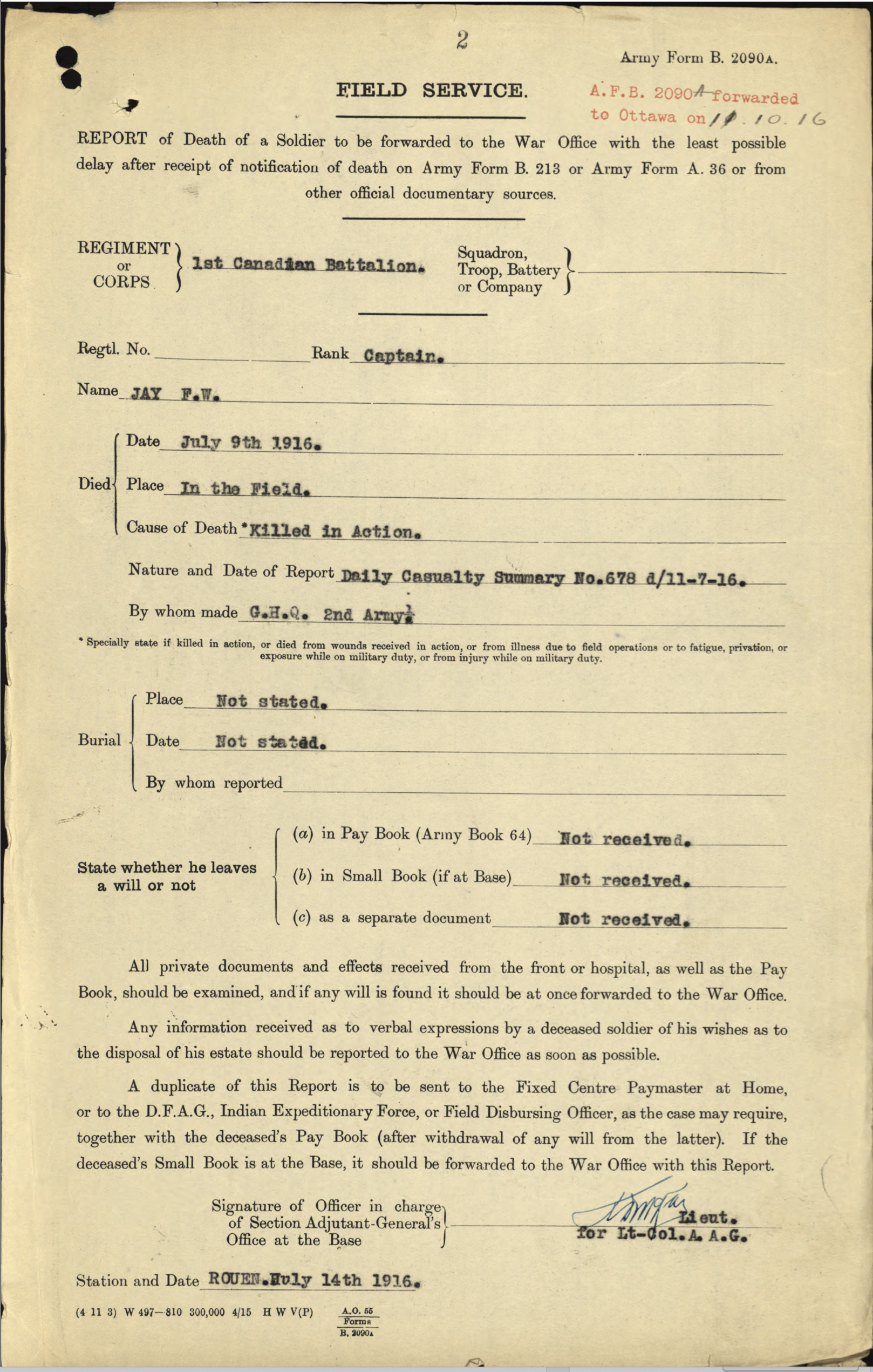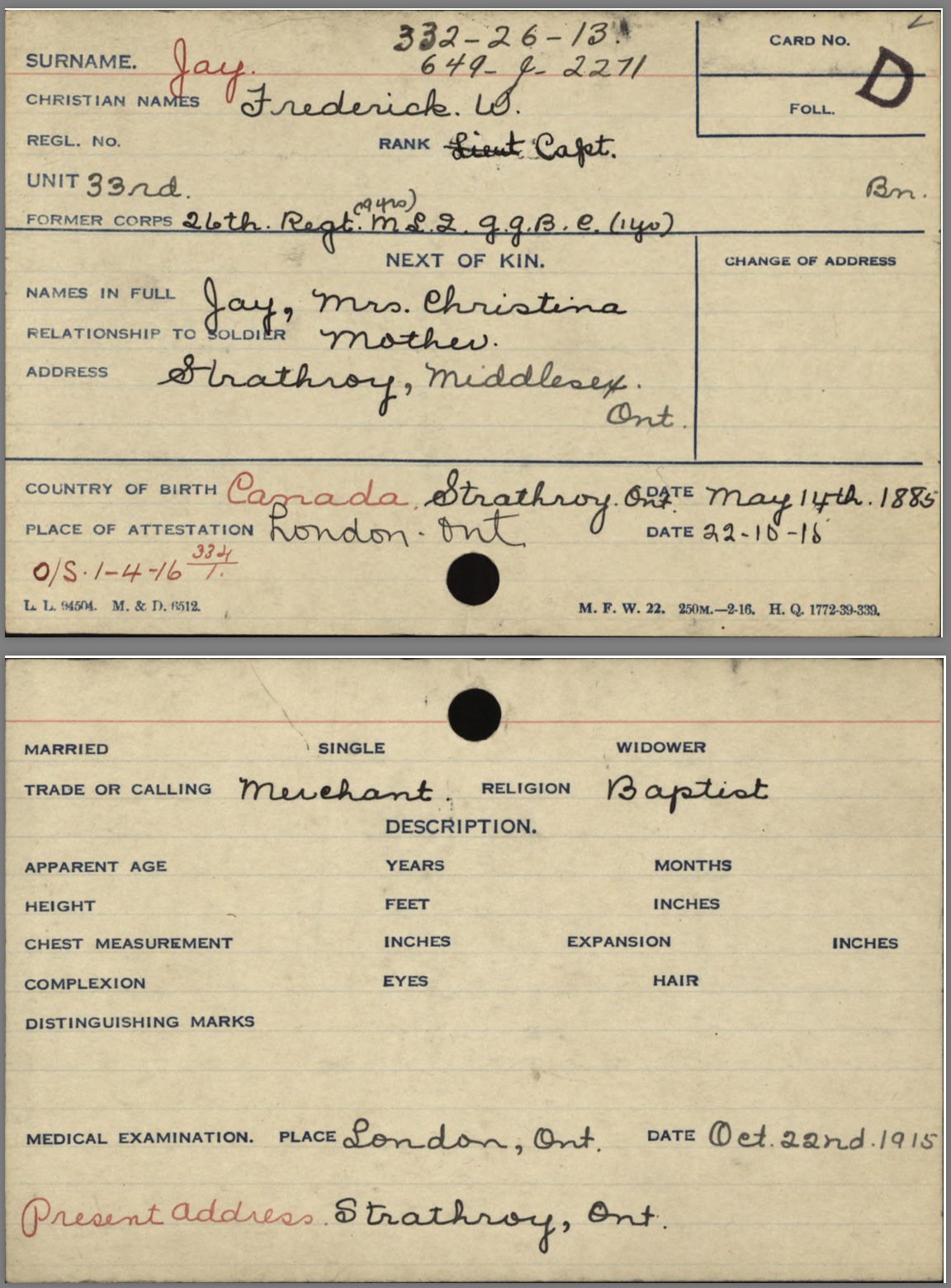 After the 33rd Battalion was redistributed, he served in the 1st Btn. Thus, Fred Jay does not have the usual “Attestation” paperwork but has an “Officers’ Declaration Paper” instead. He was promoted to Captain on November 18, 1915, while still in Canada.