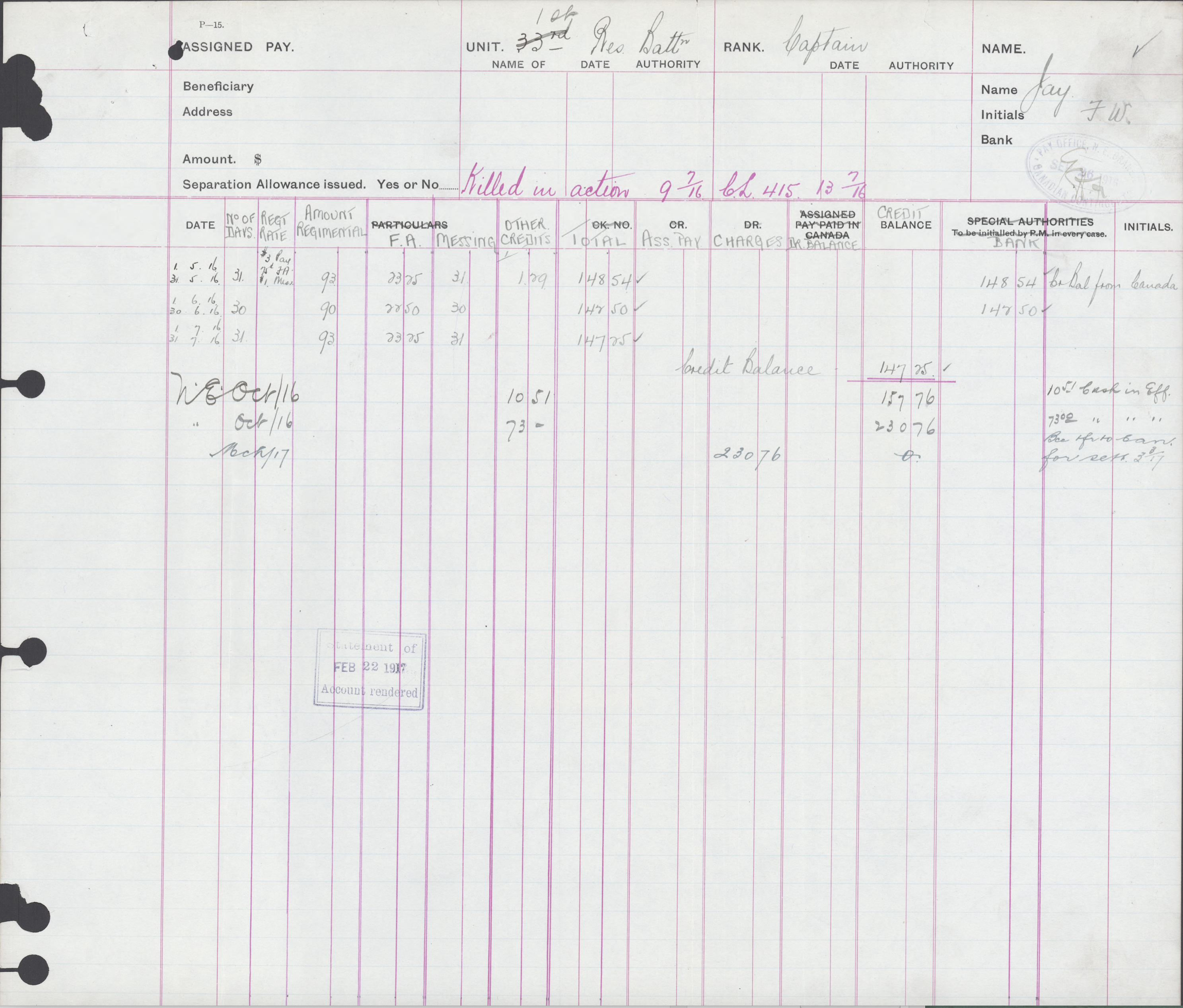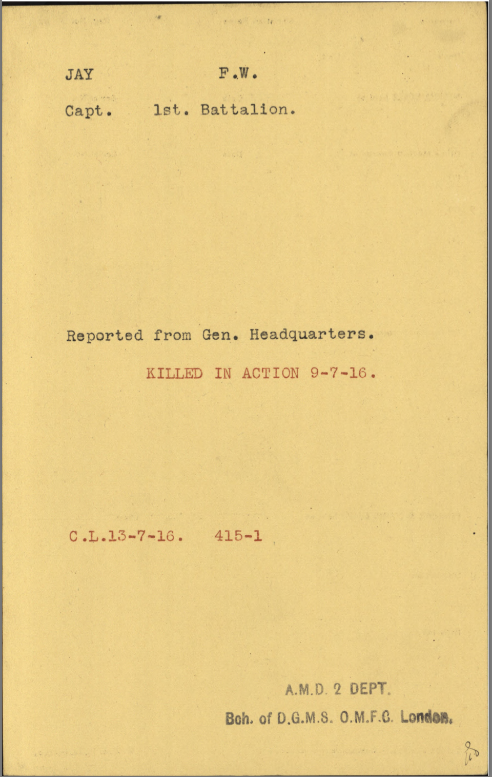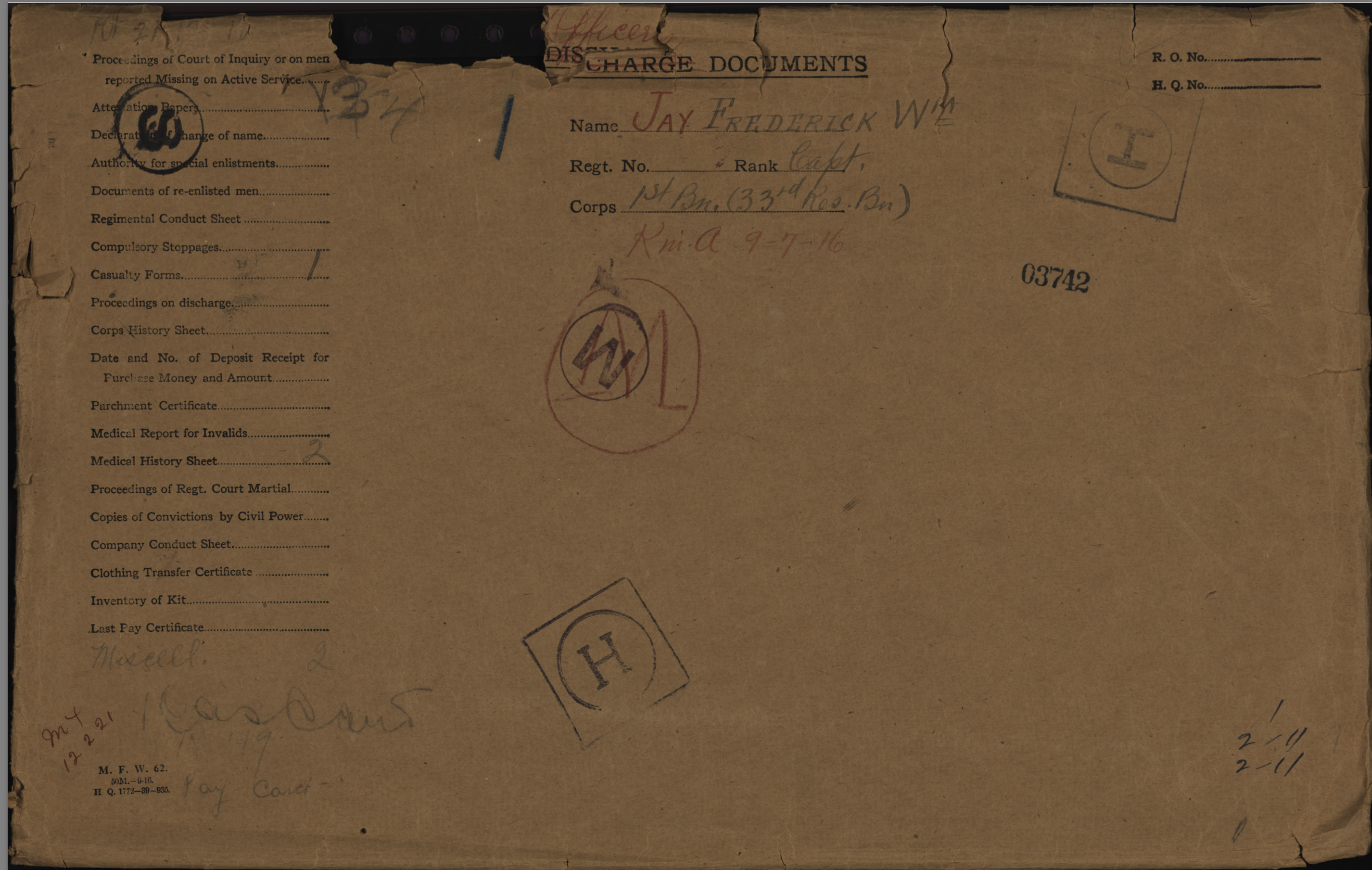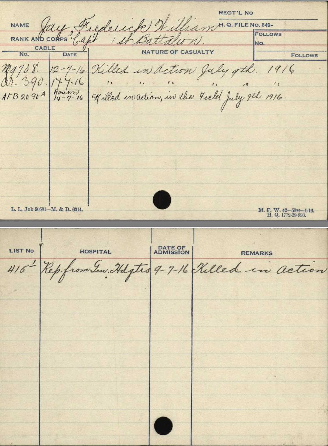 After the 33rd Battalion was redistributed, he served in the 1st Btn. Thus, Fred Jay does not have the usual “Attestation” paperwork but has an “Officers’ Declaration Paper” instead. He was promoted to Captain on November 18, 1915, while still in Canada.