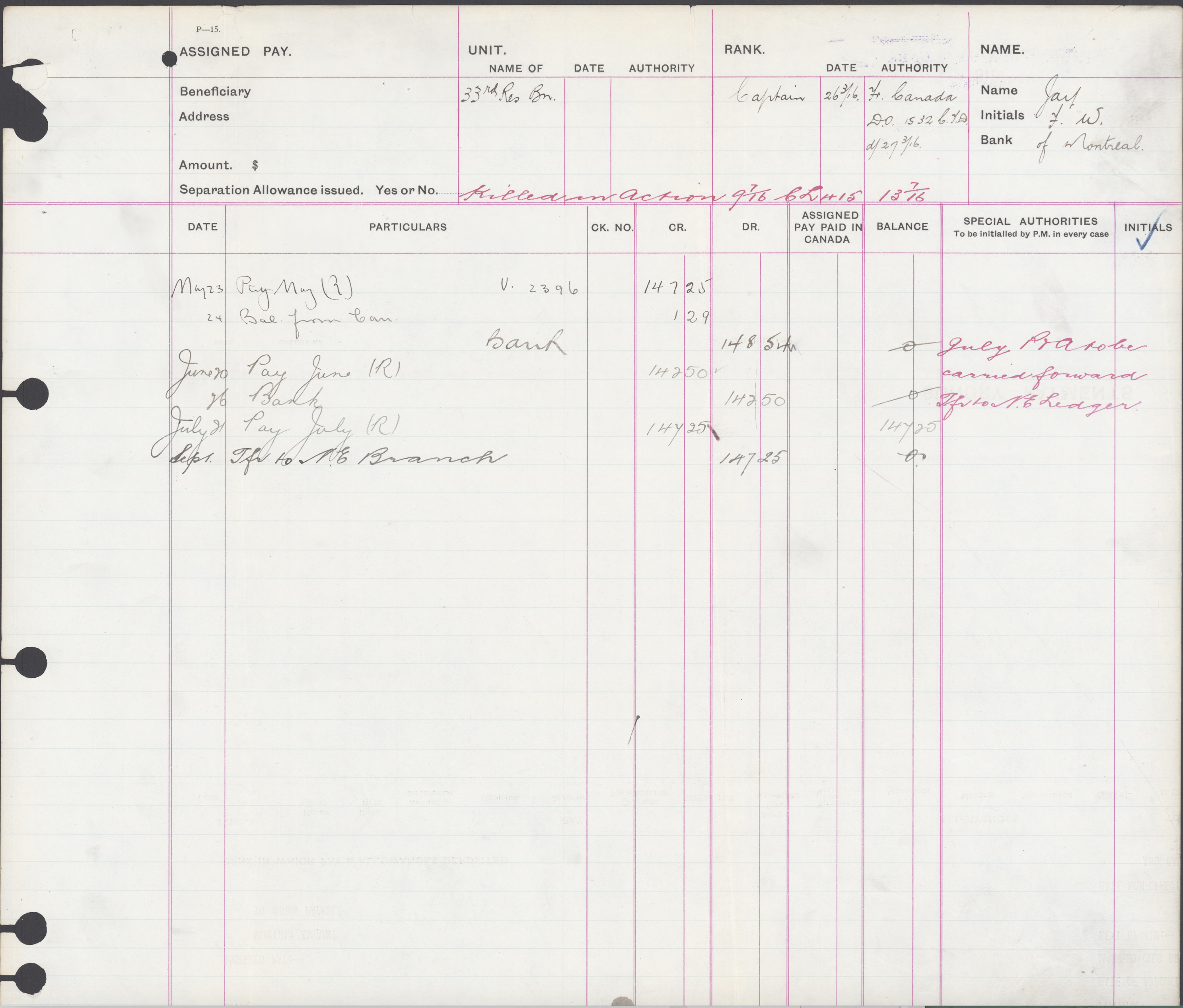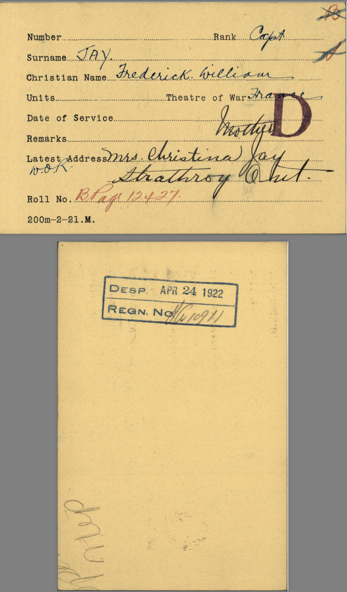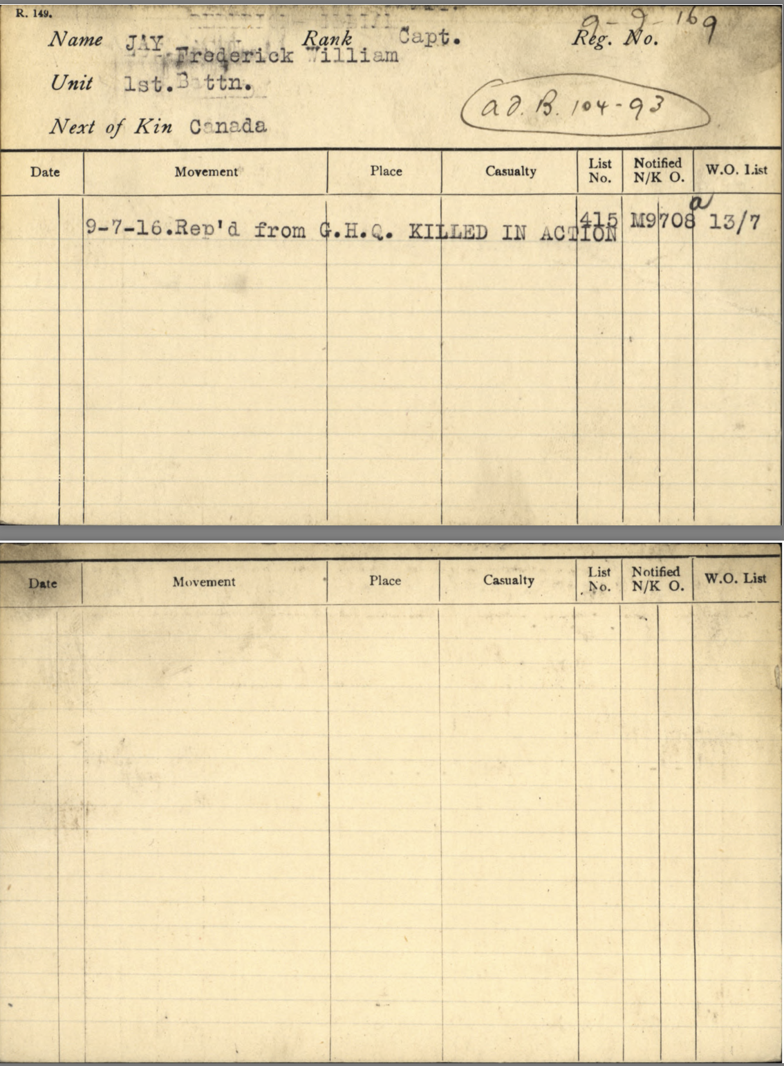 Captain # ____?___ (The official record documents show no regimental number, which is out of the ordinary. The bac-lac-gc.ca records indicate a reference item number of 486070, which allows access to all the official files shown at the bottom of this page.)