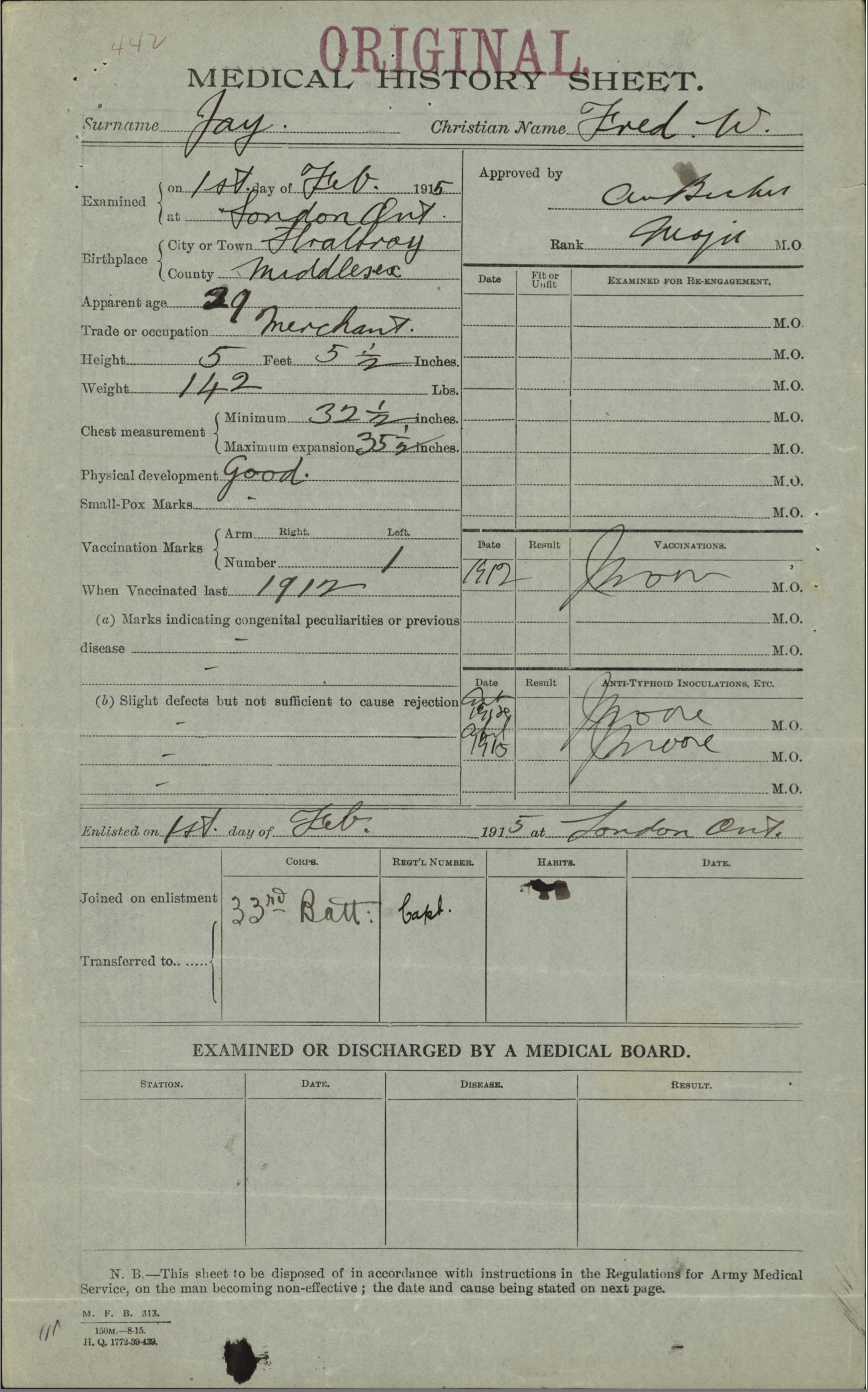 Fred had served 1 year with the G.G.B.G. and 9 years with the 26th Regiment M.L.I. before the war. He brought his commission, with the rank of Lieutenant, to the 33rd Overseas Battalion CEF on October 22, 1915, in London, Ontario. Fred Jay, when he enlisted, was 29 years old, 5 feet 5 1/2 inches tall, weighed 142 pounds. His physical development was reported as “Good” and he had been last vaccinated in 1912.