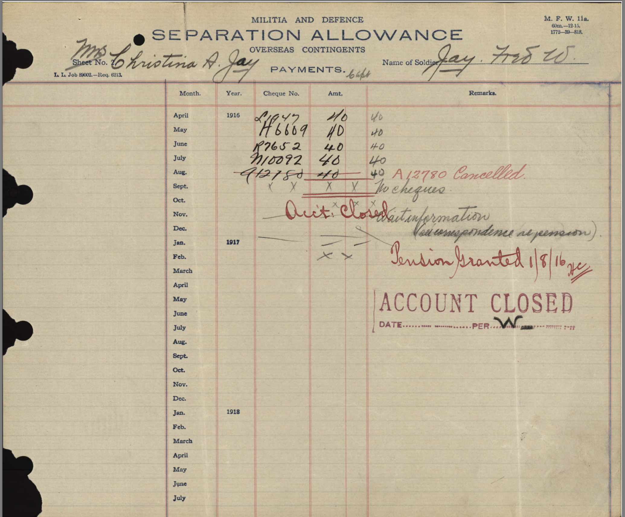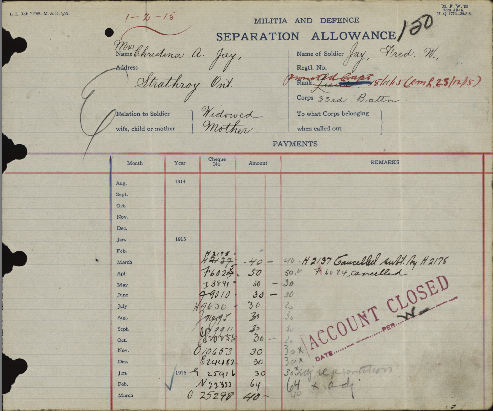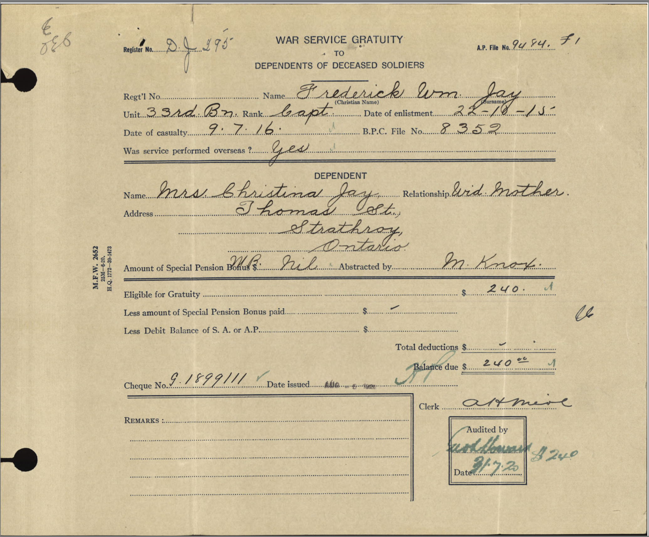 Fred Jay’s mother, Christina Jay, who was living on Thomas Street in Strathroy, received 13 “Separation Allowance” payments totalling $464 during his absence. These payments were made as his mother was a widow requiring support. She received a “War Gratuity” of $240.00 following his death. A pension had been granted but the account was closed at an unknown date. It is unknown how his widowed mother supported herself after Fred’s death. [Perhaps the family will contact the editor with further information if they choose. (royboysask63@gmail.com).]