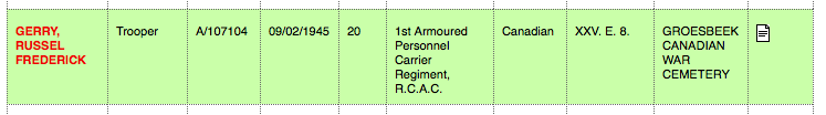 Russell went to France and participated in the D-Day invasion on June 6, 1944. Later he fought in Belgium and Holland. He was killed in action on February 9, 1945, in Cleve, Germany, during “Operation Veritable”. The two other members of his crew, Trooper A. DeLisle and Trooper J. W. Park were also killed. Russell was 20 years old when he died. He is buried in the Groesbeek Canadian War Cemetery in Nijmegen, Holland. General Harry Crerar, the commander of the 2nd Canadian Infantry Division in Holland, ordered that all Canadian soldiers killed on German soil be reburied in the two cemeteries eventually established in eastern Holland at Holten and Groesbeek. He wanted his men to lie in ‘friendly soil’.*