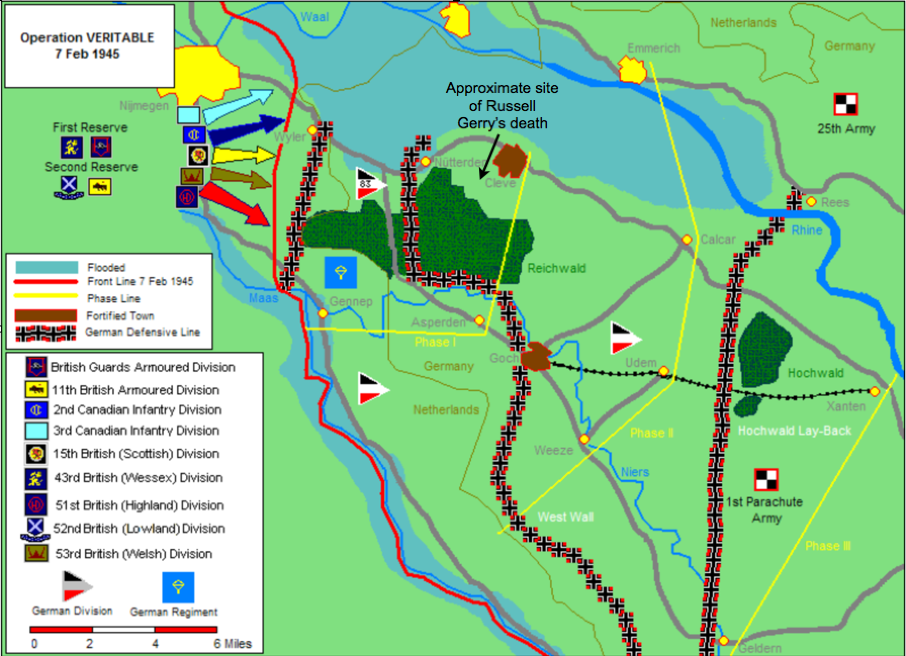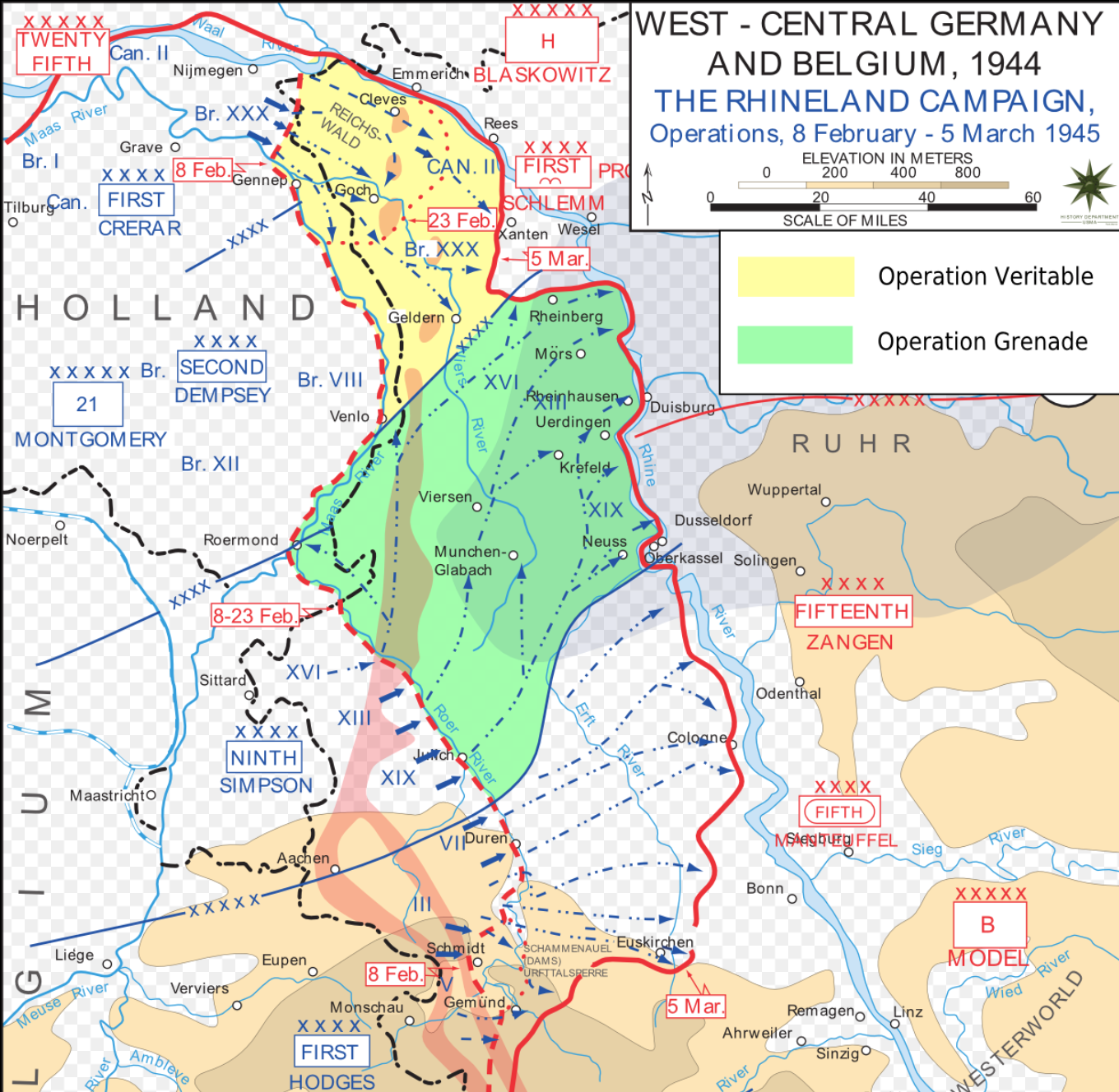 “Operation Veritable (also known as the Battle of the Reichswald) was the northern part of an Allied pincer movement that took place between 8 February and 11 March 1945 during the final stages of the Second World War. The operation was conducted by Field Marshal Bernard Montgomery‘s Anglo-Canadian 21st Army Group, primarily consisting of the First Canadian Army under Lieutenant-General Harry Crerar and the British XXX Corps under Lieutenant-GeneralBrian Horrocks. The objective of the operation was to clear German forces from the area between the Rhine and Maas rivers, east of the German/Dutch frontier, in the Rhineland. It was part of General Dwight D. Eisenhower‘s “broad front” strategy to occupy the entire west bank of the Rhine before its crossing. Veritable (originally called Valediction) had been planned for execution in early January 1945 when the ground had been frozen and thus more advantageous to the Allies. The Allied expectation was that the northern end of the Siegfried Line was less well defended than elsewhere and an outflanking movement around the line was possible and would allow an early assault against the industrial Ruhr region.”